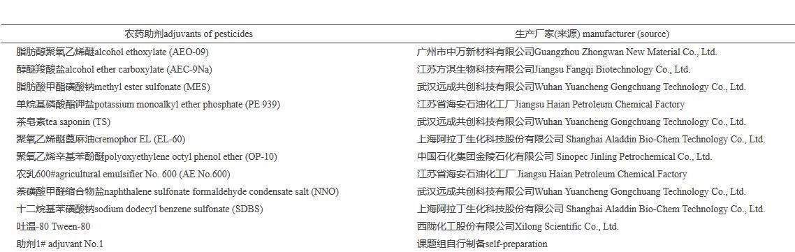 目前,助剂广泛应用于日用化学工业、食品、环境、卫生、农业和新材料等各个领域,被人们形象地誉为“工业味精”[31-32]。助剂的应用大大地提高了农药施用率,减少环境污染;然而,由于国内各农药制剂和助剂生产企业生产技术及工艺存在差异,致使市场上的助剂和农药制剂的品质不一,不同种类甚至同种助剂的性质和施用效果也不同,大多数农药制剂在推荐剂量下其药液并不能很好的润湿靶标植物[20],因此,合理选择和安全使用助剂尤为重要。