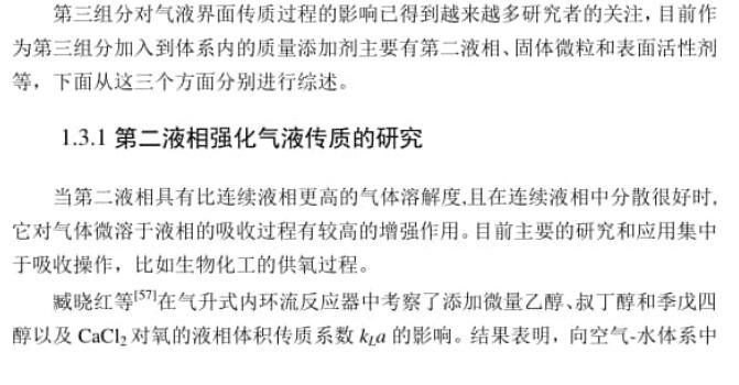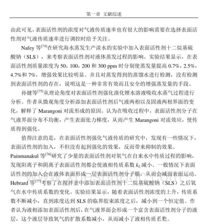 首先,研究了在液相中添加三种不同临界胶束浓度的表面活性剂对气液比表面积和传质系数的影响。实验结果表明,表面活性剂在气液界面聚集,会增大气液比表面积,但由于胶束现象的存在,会减小CO2吸收的总包传质系数和液相传质系数,因此临界胶束浓度是表面活性剂的一个重要参数。其次,研究了向气相加入低表面张力物质(乙醇和正丙醇)对气液两相传质的影响,并探讨增强传质过程的途径。气相低表面张力物质的添加,使液体表面出现了局部流动现象。通过高速摄像技术进行拍摄,并采用软件进行处理,得到了局部Marangoni对流现象的速度分布。进而证实了在气相中添加低表面张力物质能够诱导产生局部Marangoni对流现象。然后利用鼓泡塔传质装置,研究了气相中加入少量乙醇对水-CO2吸收过程传质的影响。CO2气体中添加少量乙醇后,鼓泡塔中的气泡尺寸变大,气泡比表面积变小,而液相传质系数增大,综合结果促进了气液传质。