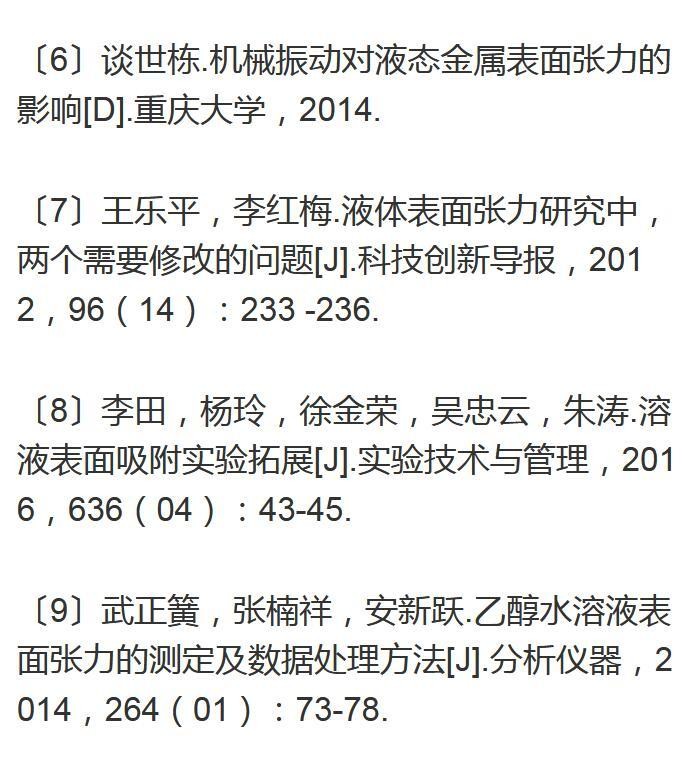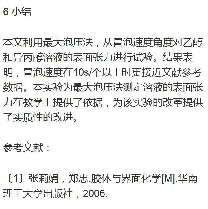 【摘要】:对于最大泡压法测定表面张力的实验,我们通过调整冒泡速度对其进行实验探索。实验测试了冒泡速度分别为3,5,7,9,11s/个时,乙醇与异丙醇两种溶液在浓度为10%,20%,30%,40%,50%时表面张力的大小。结果显示,不同浓度的乙醇与异丙醇溶液,当冒泡速度为11s/个时,这两种溶液的表面张力值最接近理论值。因此在测定表面张力的实验时冒泡速度控制在10s/个以上,所得数据更精确。通过初步探索为表面张力实验的教学改进提供了依据。