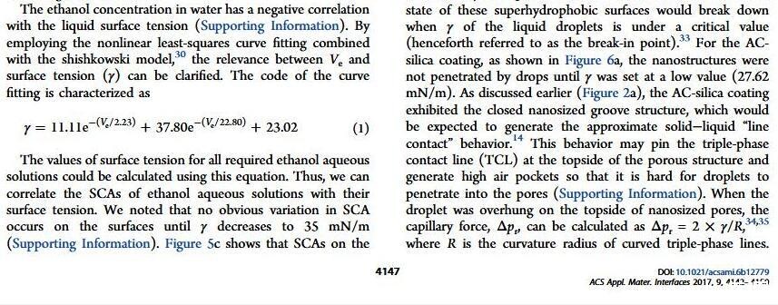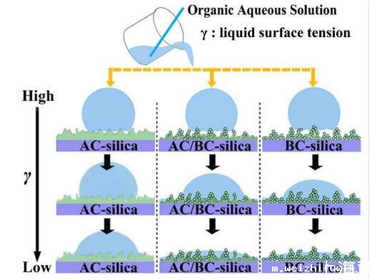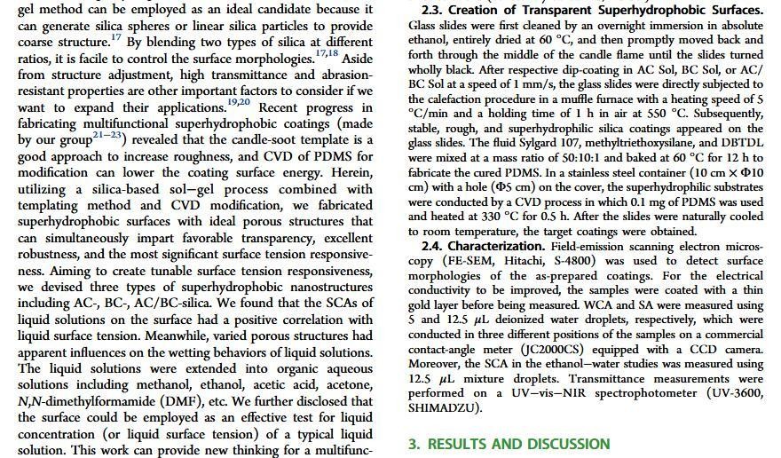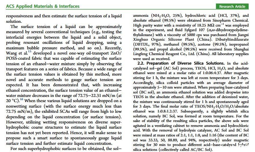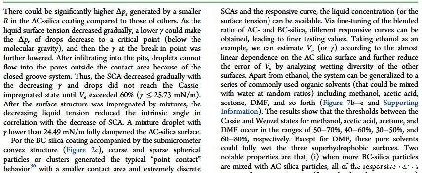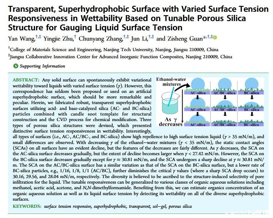 当液体的表面张力发生变化时,它在普通固体表面的润湿性也会随着变化。然而,关于这一规律以及尤其是在超疏水表面的表现的研究很少。最近,协同创新中心PI-6管自生老师课题组研究生王研等人利用上述的表面张力和润湿性的响应关系首次将透明超疏水涂层应用在探测液体表面张力方面,为拓宽多功能超疏水涂层的应用提供了一个新的思路,相关论文已被ACS applied materials&interfaces发表。研究表明,随着有机物水溶液中有机物体积分数上升,溶液的表面张力相应地下降,溶液液滴在制备的超疏水涂层的接触角也逐渐下降,此称之为表面润湿性对表面张力的响应。基于此响应关系,可以通过接触角估测液体的表面张力以及有机物的浓度。