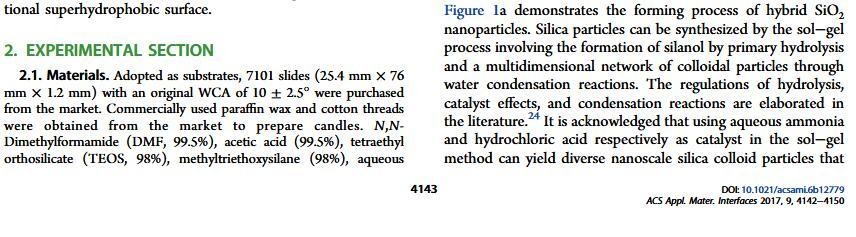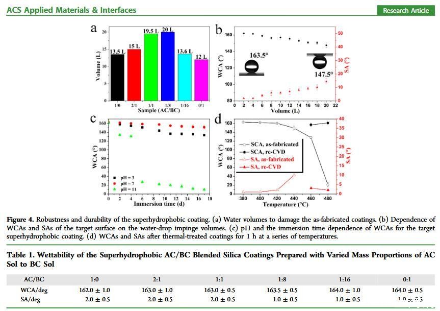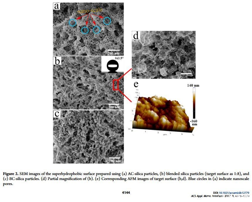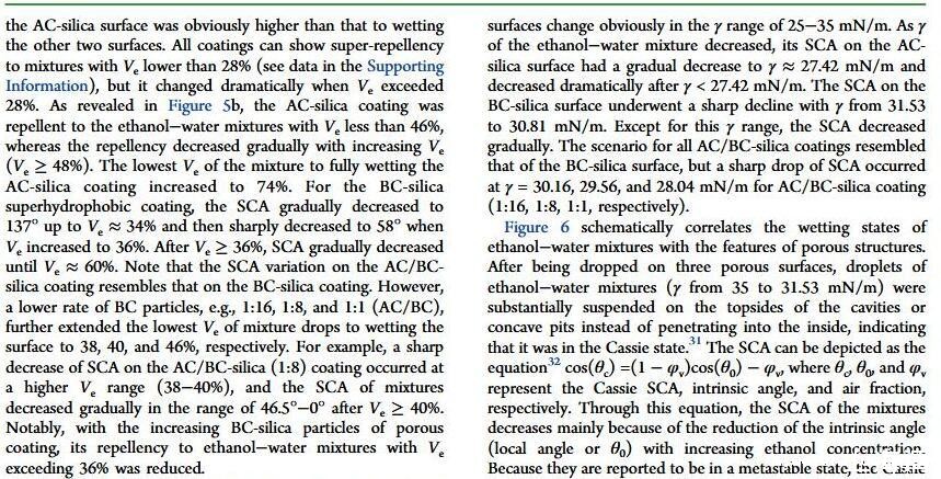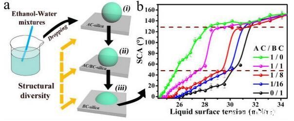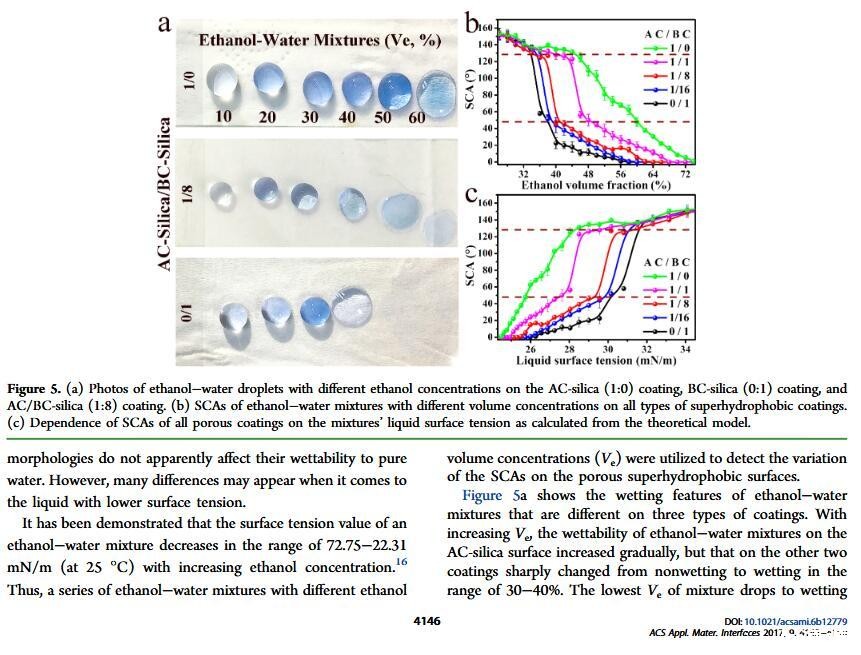 结果表明,以正硅酸四乙酯为前驱体通过酸性和碱性水解法制备了不同形貌的纳米二氧化硅溶胶,通过混合两种溶胶可制备出具有颗粒间键桥强度高的亚微米级凸起和纳米级凹坑的结构的涂层。通过控制酸碱催化溶胶混合比例,我们可以制备出具有不同微观结构的超疏水涂层。结果表明具有不同结构的涂层具有不同的润湿性-表面张力关系,随着涂层制备时碱催化溶胶的比重增加,纳米级凹坑结构逐渐减少,表面更容易被低表面张力液体侵入,因而接触角下降更剧烈。并且在有机物水溶液,包括:甲醇、乙醇、正丙醇、异丙醇、乙酸、丙酮、N,N’-二甲基酰胺等,都具有同样的接触角和浓度(表面张力)响应规律。