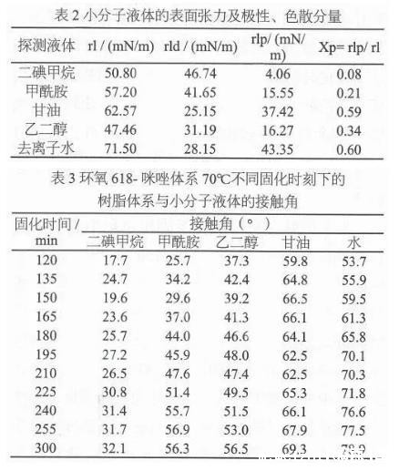 表2为实验所用小分子液体的表面张力及极性、色散分量,表3为环氧618-咪唑体系70℃不同固化时刻下的树脂体系与小分子液体的接触角。