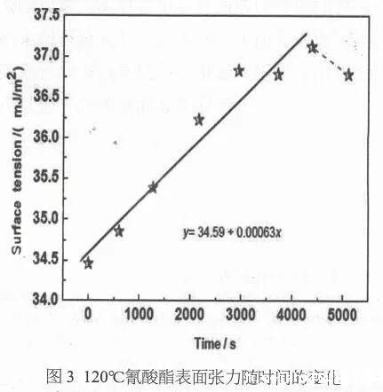 从图3中,我们可以看到含固化剂的氰酸酯树脂体系在恒温温度120℃下表面张力变化关系为线性增加段和表面张力突降段。