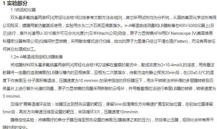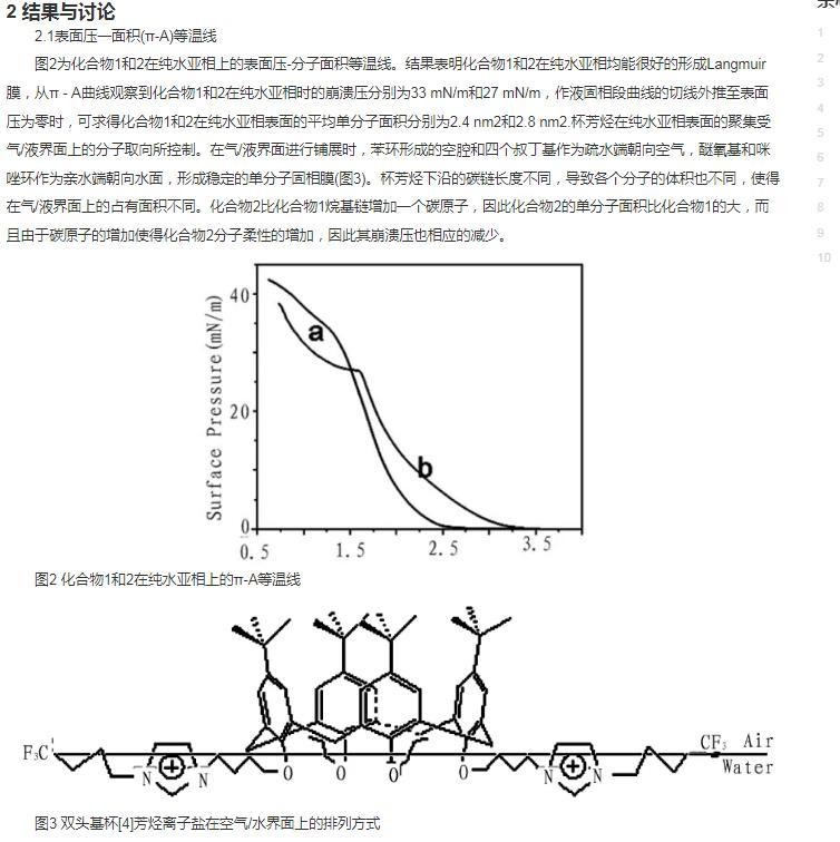 Langmuir-Blodgett膜技术(LB膜)是一种精确控制薄膜厚度和分子排列的单分子膜沉积技术,即在水气界面上能将成膜材料分子加以紧密有序地排列,形成单分子层,然后再转移到固体衬底上的制膜技术,利用该技术可以将功能化合物的光学、电磁学、分子识别与催化等性质转移到膜材料中。杯芳烃是继环糊精、冠醚之后出现的第三代超分子主体分子,它具有空腔可调节,构象可变换,并易于化学改性和修饰等特点,特别是对它进行适当修饰以后的化合物在材料化学,配位化学,生物化学等领域表现出潜在的应用前景与研究价值。基于上述认识最近我们合成了双头基多氟烷基两亲杯芳烃化合物1和2(图1),并对该化合物在空气/水相界面的成膜性能以及LB膜的结构进行了研究。