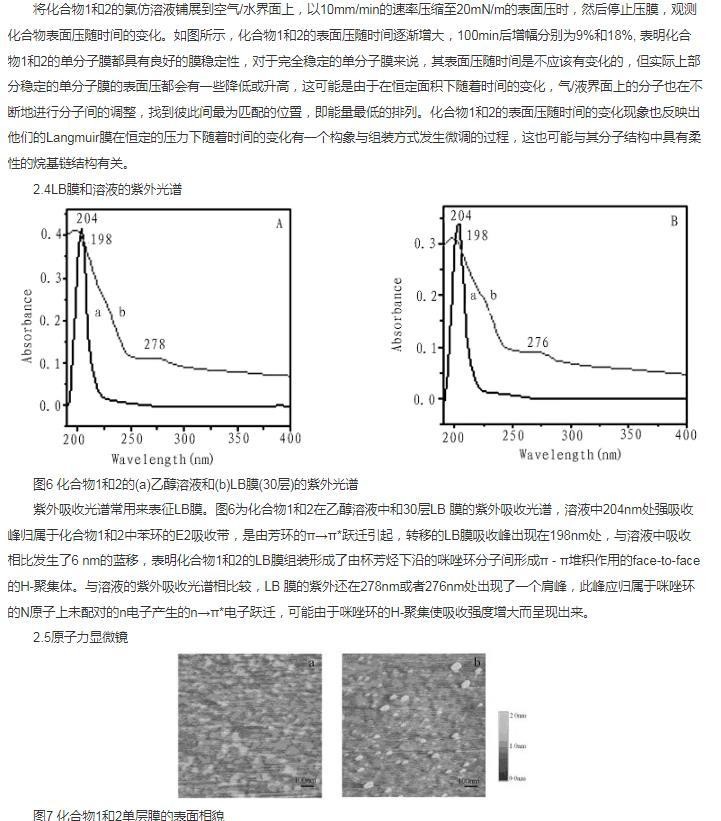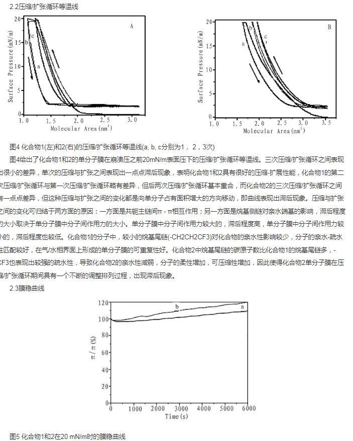 合成了双头基多氟烷基两亲杯芳烃化合物1和2,并对该化合物在空气/水相界面的成膜性能进行了研究,利用表面压一面积(π-A)等温线、压缩/扩张循环等温线与膜稳曲线,紫外光谱和原子力显微镜对组装的LB膜进行了结构表征,表明化合物1和2在空气/水相表面均能很好的形成稳定的Langmuir膜,取代基碳原子数的增加使得化合物2的Langmuir膜单分子面积增加,崩溃压相应减少,组装的LB膜均为H-聚集体,结构均匀,稳定性好。