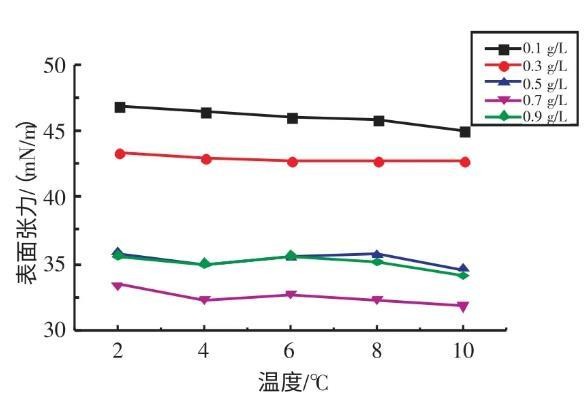 2.2.1不同温度下十二烷基苯磺酸钠溶液表面张力与浓度的关系实验研究了在温度为2、4、6、8、10℃条件下,SDBS溶液的表面张力与浓度的关系(见图3)。由图3可知,当浓度在0.1~0.7 g/L时,随着SDBS溶液浓度的升高,其表面张力逐渐减小;当浓度在0.7~0.9 g/L时,随着SDBS溶液浓度的升高,其表面张力逐渐增大。当SDBS溶液浓度为0.7 g/L时,其表面张力取得最小值。