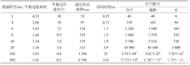若冷凝酸初始粒径为8 nm,由2 940个分子组成,平衡过饱和度1.44,酸滴表面饱和蒸气压增大44%,对应的平衡过冷温差9.5℃。在超额过饱和温差10.5℃下,等于气相过冷了约20℃,平衡过饱和度、超额过饱和度各半,此时酸滴中分子最远奔赴路程150 nm,对应的协同时间是1.5 ns,酸滴间最近距离是0.3μm。