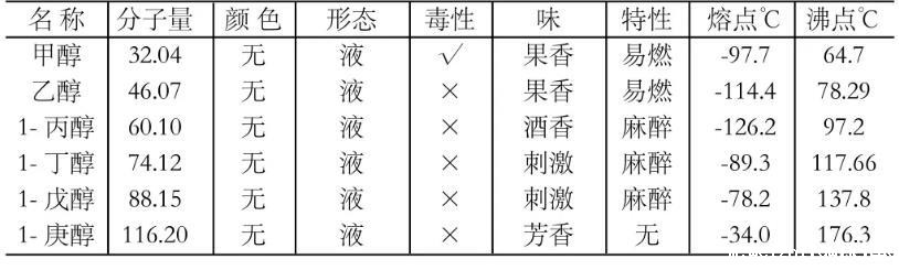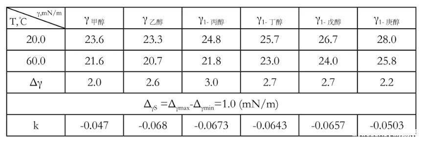 由于不同液态醇类的液态性质不同,其表面张力变化的程度如下表: