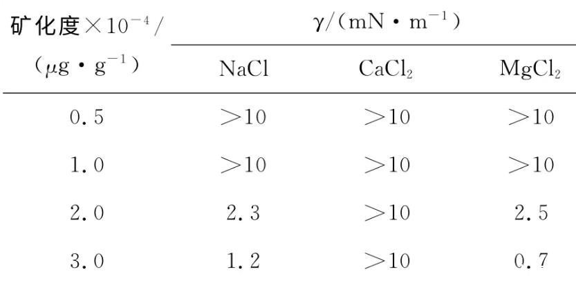 表1矿化度对0.1%C16ESB与胜利原油界面张力稳态值的影响