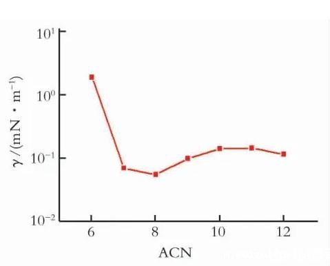 从图2与表1可以看出,同样条件下,甜菜碱与正构烷烃间的界面张力远低于原油,说明油相性质对油水界面张力有关键的影响,可能是原油中降低界面张力能力不如甜菜碱的活性组分分子在界面上的存在造成原油界面张力较高。