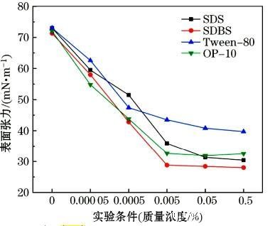 (1)表面张力的研究结果表明,溶液的表面张力均随着表面活性剂质量分数的增大呈现降低的趋势;当表面活性剂质量分数达到CMC后,溶液的表面张力不会再因为浓度而明显下降;所选试剂中非离子表面活性剂SDBS在减小表面张力的效率和效能方面最优。
