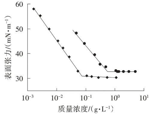 表面活性剂降低溶液表面张力的2个主要特性是降低溶液表面张力的能力与降低溶液表面张力的效率。γcmc是表面活性剂溶液在临界胶束浓度(cmc)处的表面张力,用于表征该样品降低表面张力能力的强弱。pC20为使溶液表面张力降低20 mN/m时所需质量浓度的负对数,用于表征降低溶液表面张力的效率。图1为C10~13MADS及2A1的表面张力曲线,从中获得的表面性能参数列于表1。