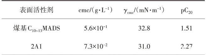 由表1可以看出,2A1的cmc低于C10~13MADS,即形成胶束的能力更强,这是由于2A1的亲水性低于C10~13MADS,疏水作用强,有利于形成胶束。2A1的pC20值大于煤基C10~13MADS,说明2A1在去离子水溶液中降低溶液表面张力的效率高于C10~13MADS。对于碳氢链型表面活性剂,气/液界面处的—CH3密度对其表面活性起着很重要的作用,—CH3密度的增大有利于溶液表面张力的降低,同时γcmc值也逐步降低。由表1可以看出,煤基C10~13MADS的γcmc大于2A1,这是由于2A1是采用四聚丙烯得到的支链十二烯为原料制备的,其疏水链的—CH3密度大于煤基C10~13MADS。