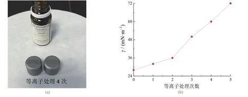 图1典型的表面张力测试照片(a)及等离子处理次数与涂层表面张力的关系(b)