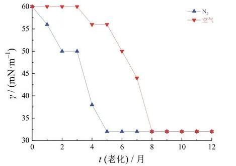 图2等离子处理后涂层的表面张力随自然老化时间的变化