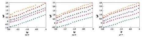 在lgc=-3.00时,可看出较完整的动态表面张力降低曲线,开始时表面张力接近溶剂的表面张力,随时间的延长表面张力先快速下降,降至一定数值后,降幅趋缓,在一段时间内基本保持不变。因为气/液界面新生成时,GSS362尚未在表面吸附,界面张力为溶剂的表面张力,随着时间的延长,表面活性剂分子开始在表面吸附,气/液界面张力降低,随着吸附的进行,表面逐步趋于饱和,表面活性剂分子在表面吸附的速率下降,因而动态表面张力下降速率变慢,趋于平衡。