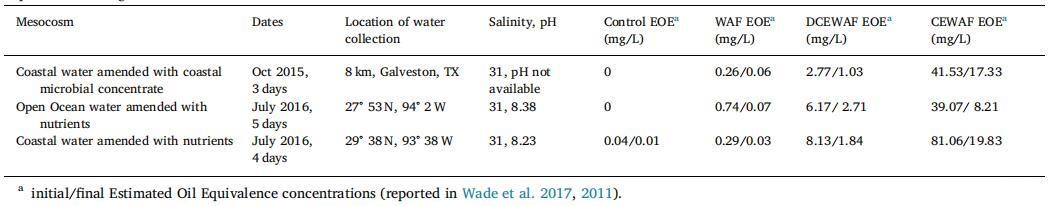 海水是从墨西哥湾收集的,用于填充 12 罐,每个 130 L,其中 4 个处理一式三份: 对照(海水)、WAF(用 Macondo 替代油,一种轻质低硫原油,化学性质类似于 在深水期间从 Macondo 井中溢出的石油 Horizon 事件)、CEWAF(Corexit + oil 比例为 1:20)和 DCEWAF (CEWAF 稀释十倍)。 仔细描述了中间宇宙的设置 在韦德等人。 (2017) 以及准备 WAF 的程序, CEWAF 和 DCEWAF。 简而言之,注入油或油 + Corexit 进入带挡板的再循环罐并混合约 24 小时,然后将下层 分数(即,避免表面光滑)被添加到各自的 坦克。 有关中宇宙实验的信息在表 1 中给出 根据估计值添加初始和最终油浓度 根据 Wade 等人确定的油当量 (EOE)。 (2011 年,2017 年)。 实验持续 3 到 5 天,运行 12:12 明暗循环。 在表 1 中,对于使用沿海 用微生物浓缩物修正的水域,浮游生物(≥63 μm)是 用网收集并转移到聚碳酸酯瓶中。 这个 将浓缩的浮游生物块引入罐中并搅拌(2 L 到每个)在开始实验之前。 对于公海水域和沿海水域的中宇宙,营养物质进行了修正, 添加营养物(最终浓度 f/20)并搅拌罐。