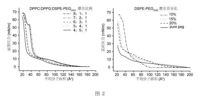 ,并在20℃下以10 mm/min的速率压缩薄膜,记录表面张力-表面积曲线。如图2所示在一系列磷脂配方中,DSPE-PEG2000