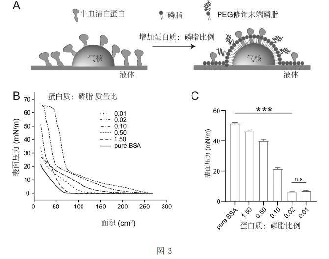 的比例为8:1:1的时候气液界面的的表面压力达到69mN/m,因此具有最低的气液界面表面张力(2mN/m)。为了探究蛋白质与磷脂在气液界面组装的规律,如图3中的A所示,选用牛血清白蛋白(BSA)作为标准蛋白质,配置好一系列不同蛋白质与磷脂质量比的磷脂蛋白质复合物,并用微量注射器将20µL磷脂蛋白质复合物(1mg/mL脂浓度)氯仿溶液涂在Langmuir-Blodgett多功能膜天平上,使氯仿蒸发10分钟。将表面的初始面积设置为282cm2