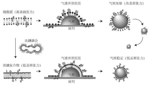 细胞膜是由蛋白质与胆固醇等分子镶嵌在磷脂中的典型双分子层结构。细胞膜仿生技术已经成功实现在纳米颗粒以及纳米液滴表面修饰组装,并实现体内的长循环以及良好生物相容性。典型的细胞膜仿生技术是将剥离后的细胞膜直接以磷脂双分子层的形式包被于纳米颗粒或液滴表面。然而由于表面张力作用,细胞膜的磷脂双分子层无法直接包被在微米级的气泡表面。