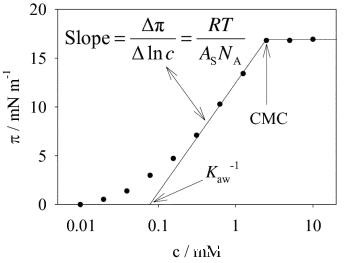 表面浓度和表面吸附量之间单层的差异(等温线斜率)可以忽略不计,因此表面浓度与在单个表面活性剂分子的有效面积成反比。